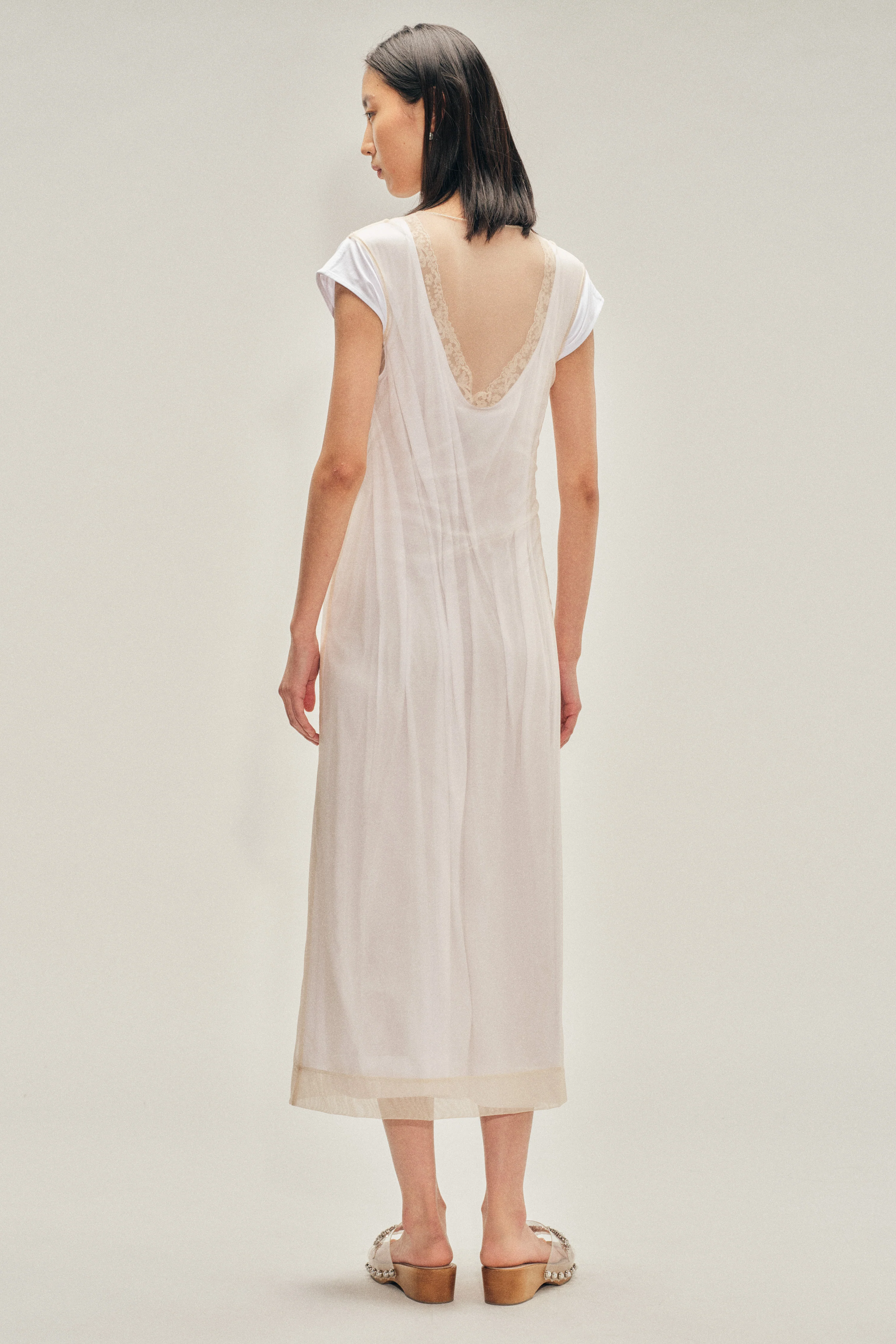 Cotton jersey cap-sleeve dress with lace-trimmed neckline and lowered back. Overlaid with fine ballet tulle for an added dimension of romantic transparency.